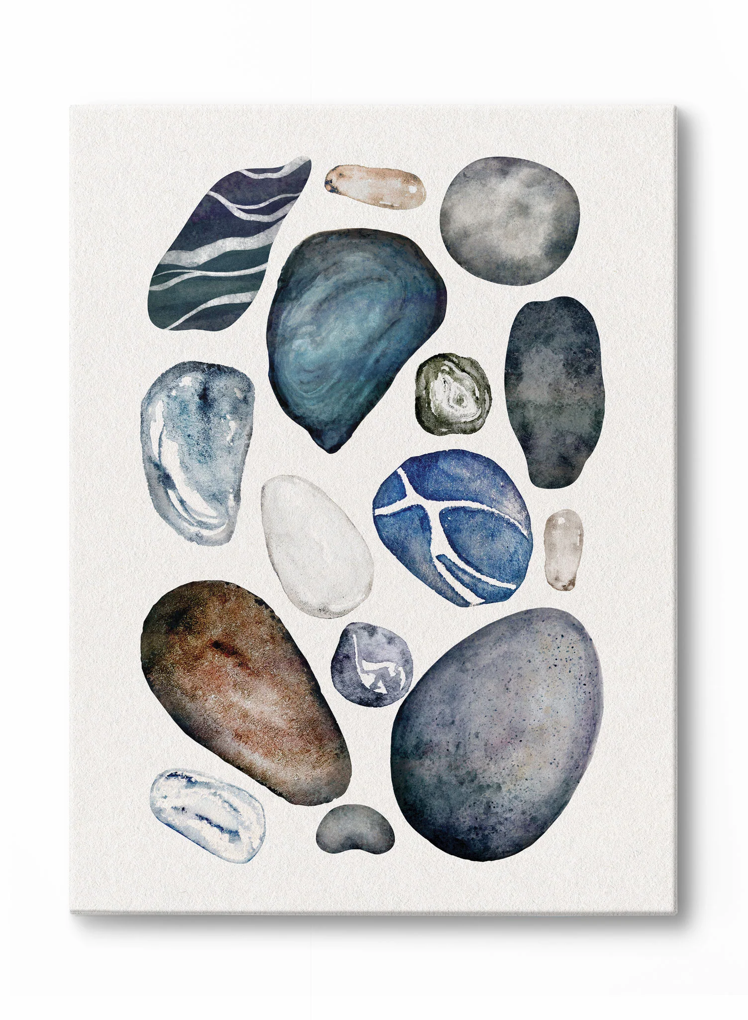 A stunning pebble collection with the convenient lightness of an art print! This lovely watercolor painting features an assortment of blue, grey, and brown rocks picked up along the shore.