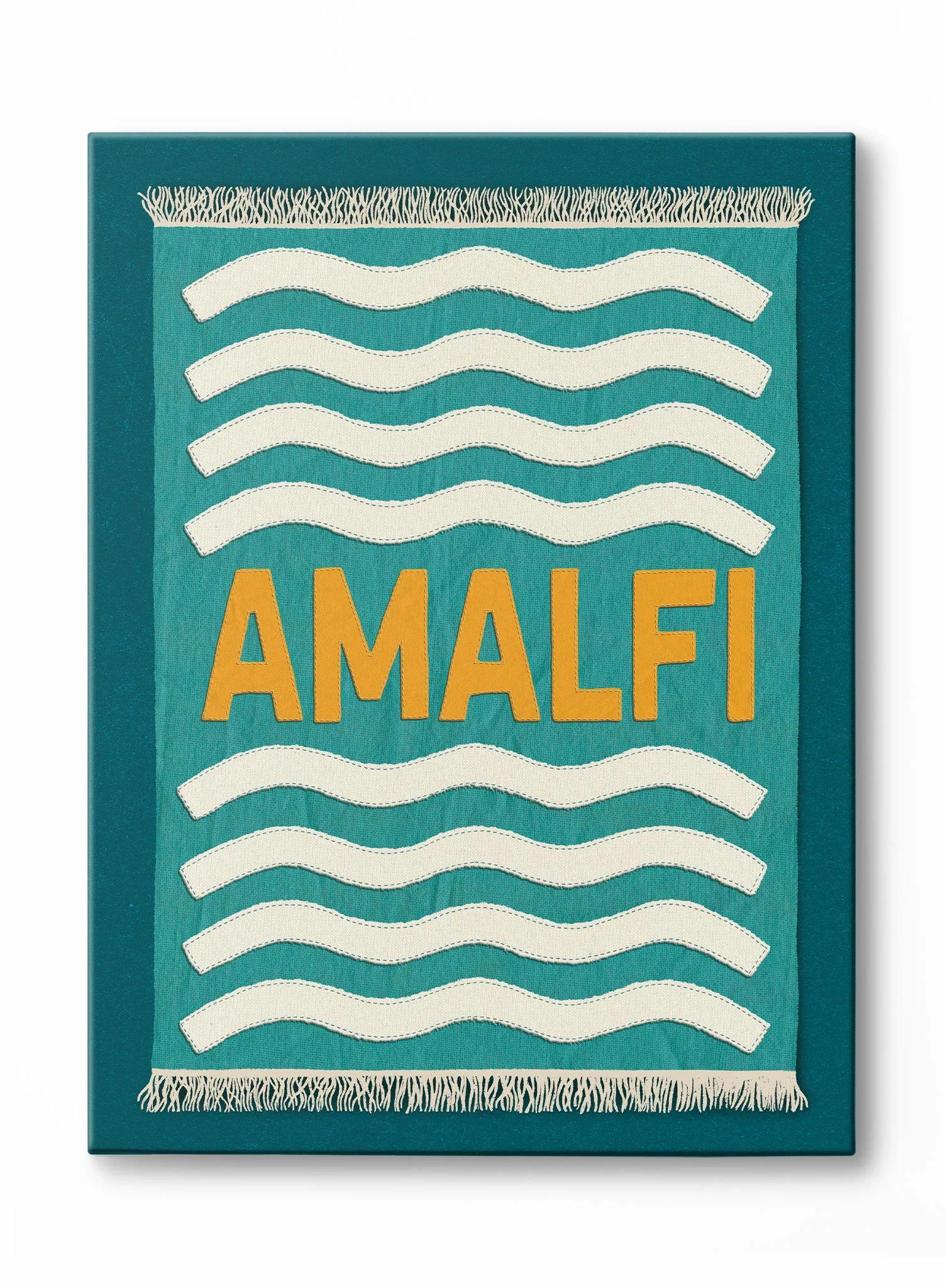 A playful, graphic tribute to the Italian coast, this art print is designed to look like a souvenir beach towel from Amalfi. The design cleverly uses the illusion of texture, with off-white, wavy lines that appear to be stitched onto the fabric and a fringe that seems woven by hand. The word "AMALFI" is rendered in a bold, friendly font, completing the charming and cheerful holiday aesthetic.