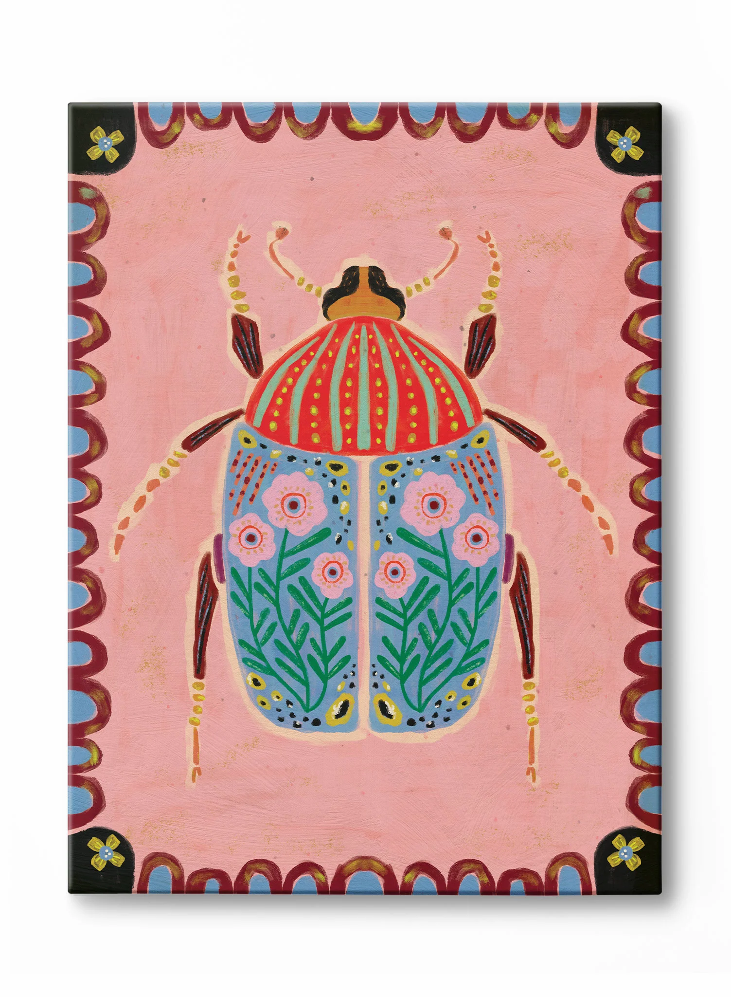 A botanical beetle with personality, this piece by Kenzie Elston blends insect anatomy with a dose of blooming cheer. Its wings are dotted with delicate pink flowers, grounded by cobalt blue and golden yellow, while a red-and-yellow thorax keeps things vibrant.
