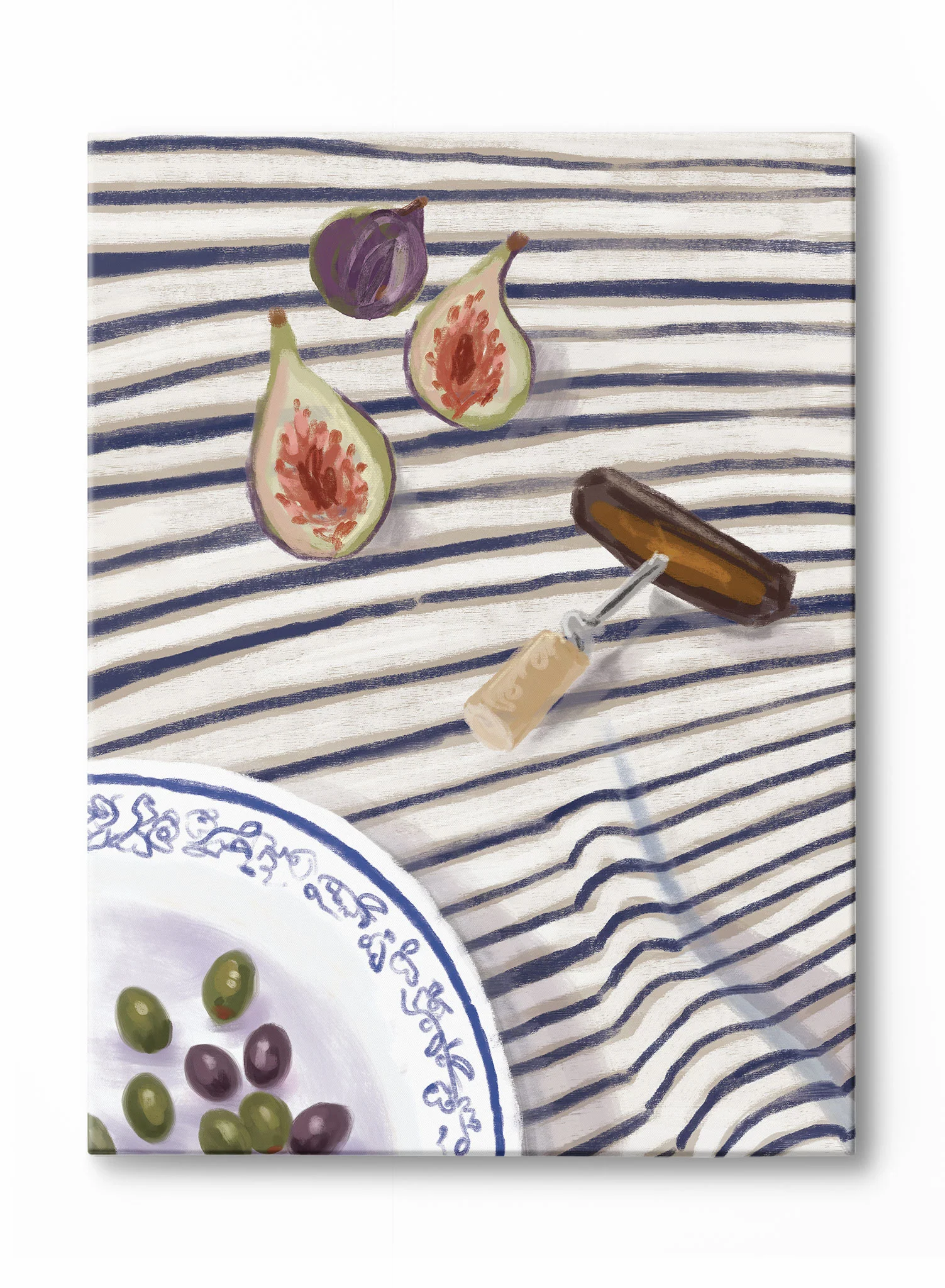 Prosciutto, fresh figs, wine, and green olives… That’s what we call a ‘Charcuterie Fantasy’! This foodie painting features a plate of charcuterie board ingredients displayed on a striped tablecloth.
