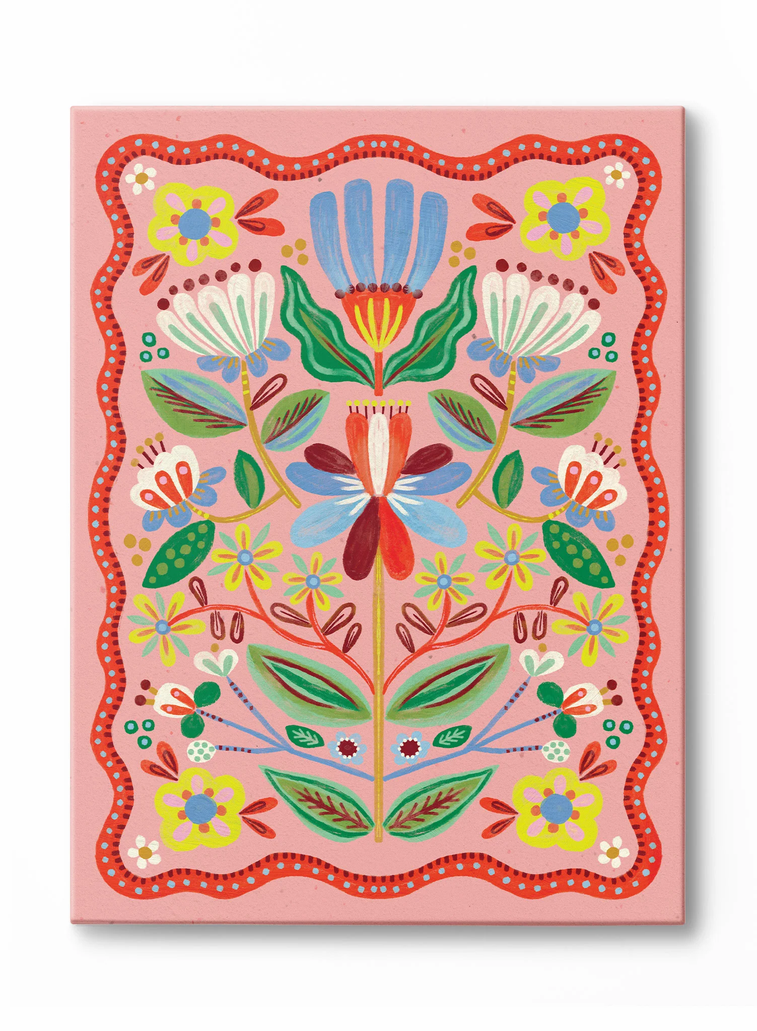 A folk-art fantasy brought to life, this floral arrangement by Kenzie Elston features mirrored blooms framed in a scalloped coral border. Each flower is outlined in painterly strokes, popping against the saturated pink backdrop.