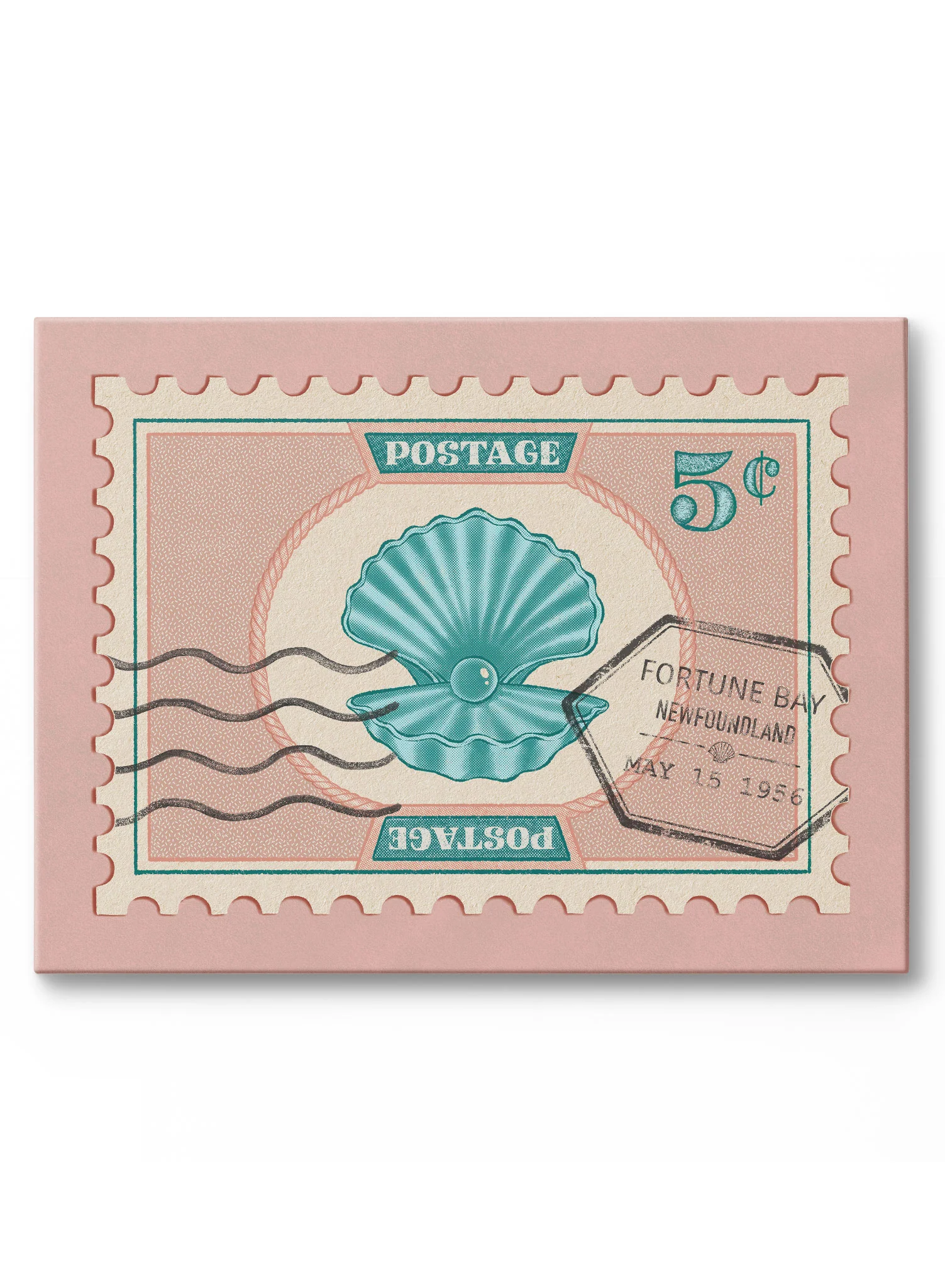 A stamp commemorating the best summer in Maine ! This pink vintage stamp illustration includes a teal clamshell, and a nod to the region of Maine in the United States.
