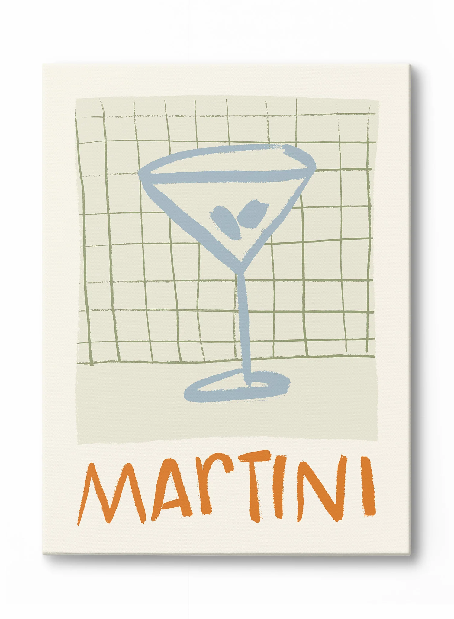 We’ll take one Martini to sip on and another to hang up! ‘Martiniville’ is an illustration of a blue Martini glass in front of a green checkered background with the word ‘Martini’ written in bold red lettering.
