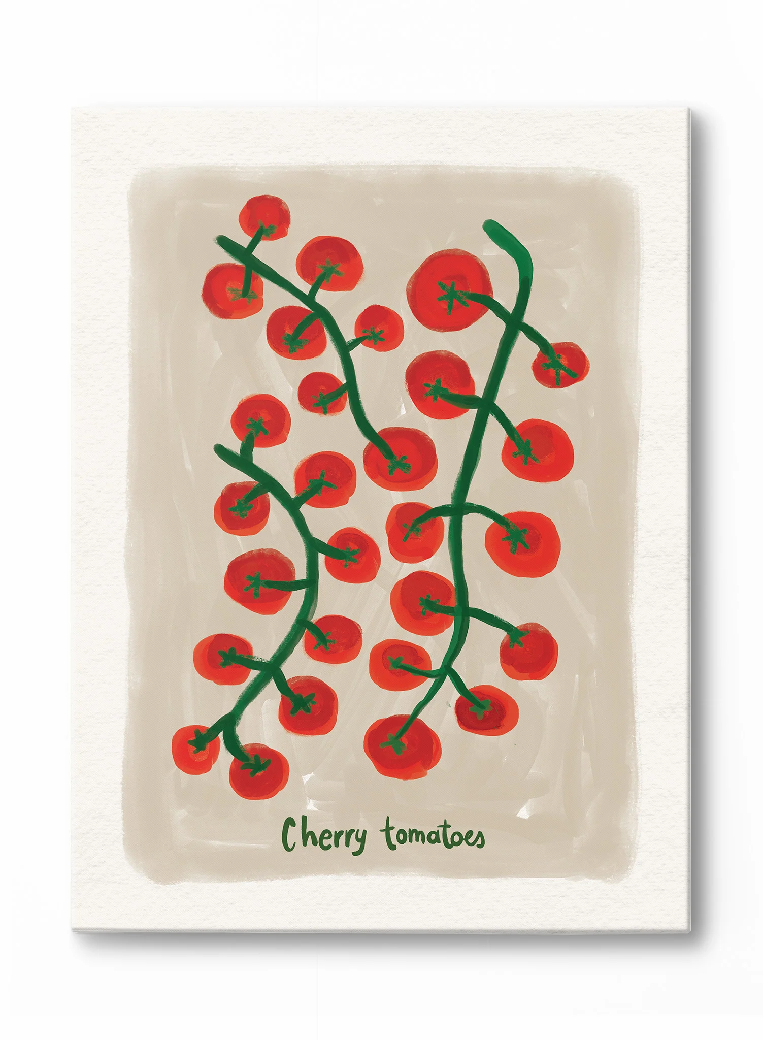 It’s not really summer until you’ve enjoyed fresh tomatoes from the garden! ‘Tomato Tango’ is a painting of red and green cherry tomatoes over a beige background.