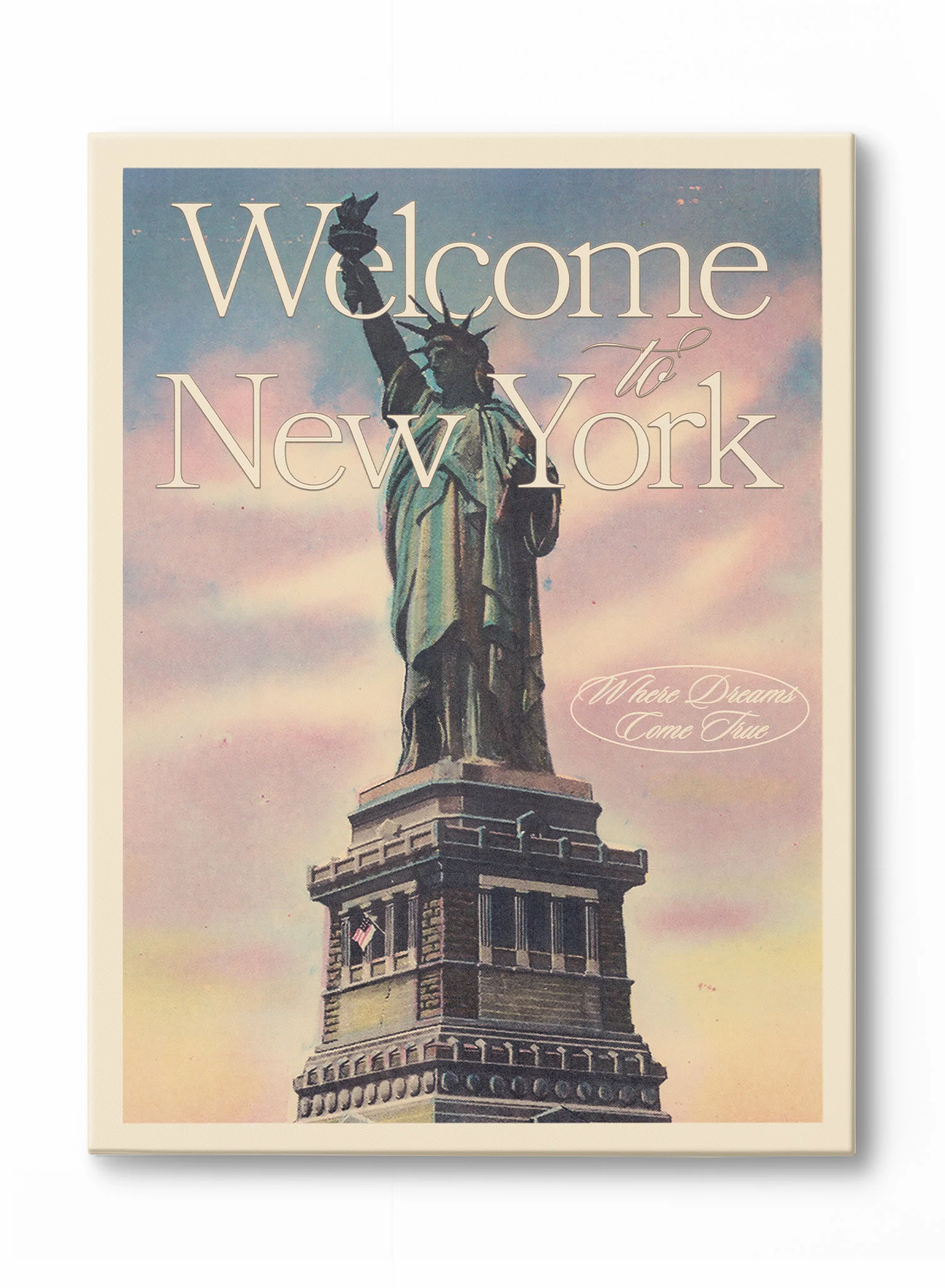 The Statue of Liberty takes center stage in this print, standing tall against a pastel-toned sky of dreamy pinks and blues. The typography, "Welcome to New York," adds an air of grandeur, celebrating the optimism and energy of the Big Apple.