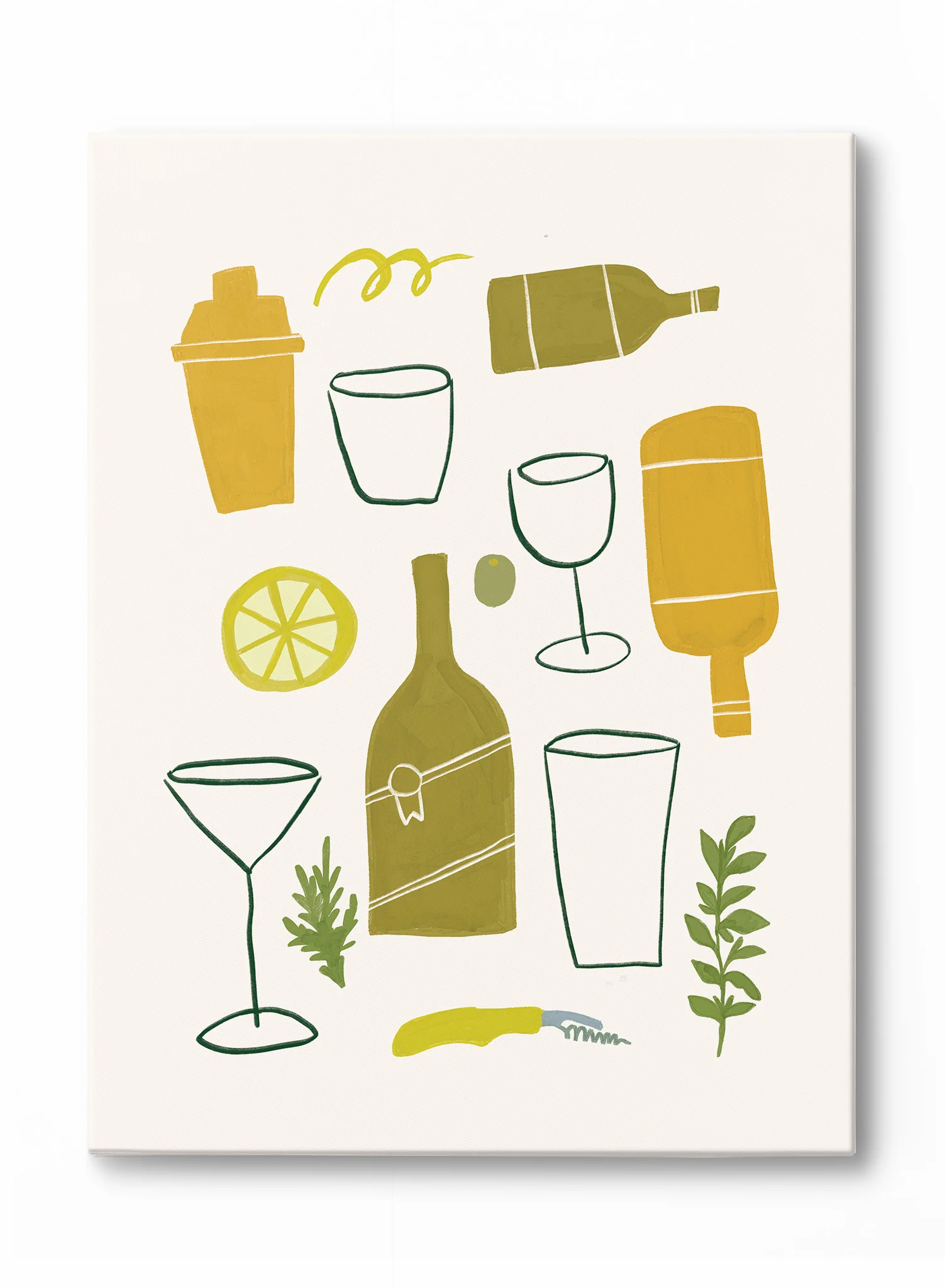 ‘What’s Shaking?’ you ask? A fabulous cocktail, thanks to these bartending essentials! This yellow and green illustration includes a shaker, bottles, glasses and delicious drink ingredients.